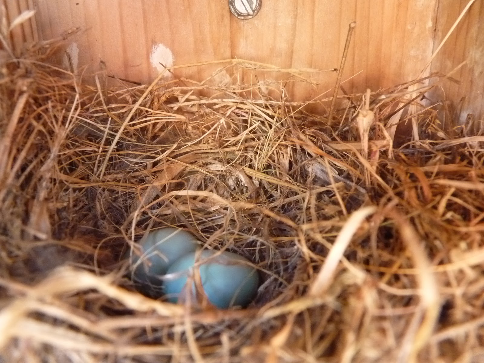I checked the bluebird nest a few days ago, and all four eggs were intact. Mama bluebird was on the nest this morning.